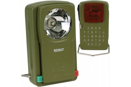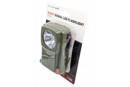 Latarka metalowa LED Falcon Eye SCOUT (FWL0032) z trzema kolorami światła. Dzięki przesłonom generuje światło białe, czerwone i zielone. Latarka wykonana jest z wysokiej jakości materiałów, została wyposażona w dwa włączniki: stały i chwilowy, który umożliwia sygnalizację alfabetem Morse'a. Na obudowie znajduje się alfabet Morse'a, umożliwiający komunikacje w sytuacjach awaryjnych.